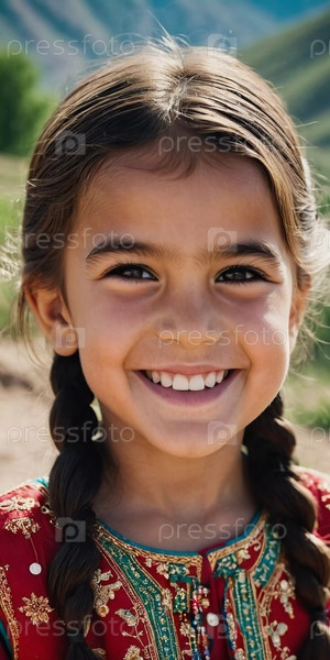 Молодая улыбающаяся 5-летняя девочка таджикской национальности стоит на улице, одетая в традиционную одежду