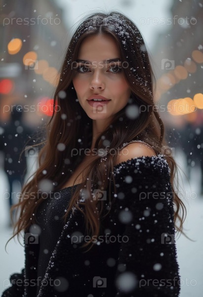 Потрясающая женщина смотрит нежно, когда вокруг нее падают снежинки в восхитительной городской обстановке, захватывая магию рождественского сезона