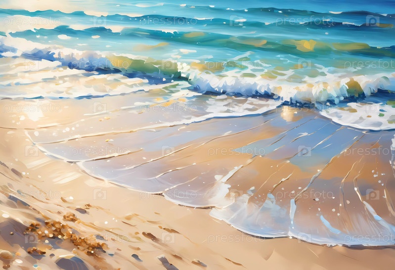 Потрясающий летний фон имеет берег мягкого песчаного пляжа рядом с ярко-синим морем. солнечный свет светит на поверхность воды, создавая спокойную атмосферу. живопись. генерация ИИ