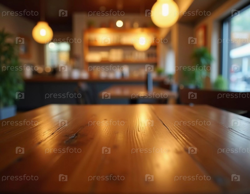 Теплый деревянный стол создает уютную атмосферу в шумном кафе. Мягкие огни освещают фон, где посетители наслаждаются напитками и разговорами