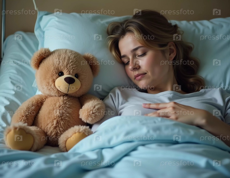Молодая женщина лежит на больничной койке, спокойно отдыхает рядом со своим пушистым спутником