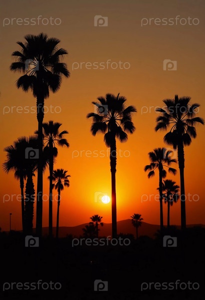Силуетированные пальмы простираются к блестящему закату солнца на небе, рисуя завораживающий градиент оранжевого и золотого цвета.Мягкие горы создают спокойный фон для этого тихого момента