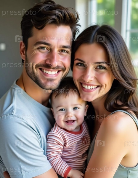 Любящая пара стоит со своим веселым ребенком, все делятся яркими улыбками в уютной помещенной среде.Солнечный свет течет, создавая тёплую атмосферу для семейных связей