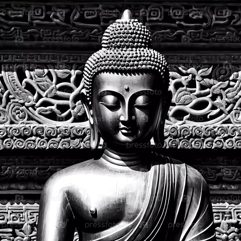 Красивая скульптура Будды грациозно стоит перед детальной каменной резьбой генеративного ИИ