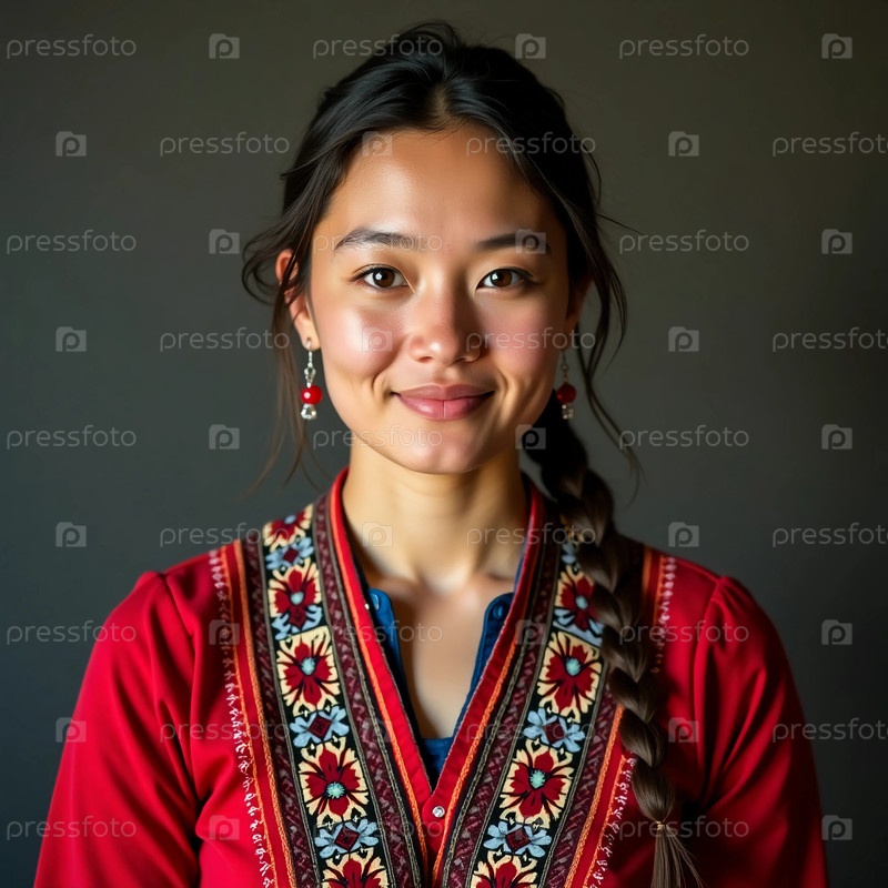 Молодая азиатская женщина уверенно стоит, украшенная яркой традиционной одеждой со сложными узорами, излучающими радость