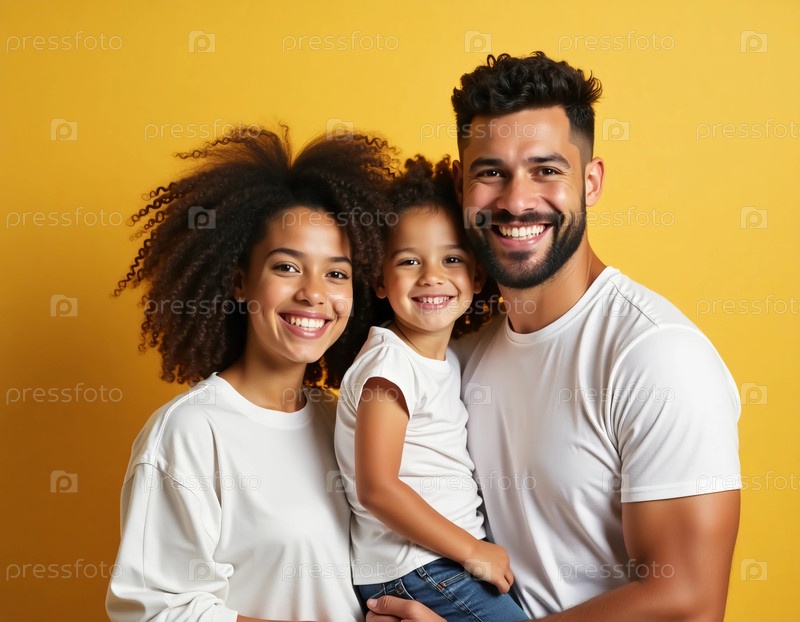 Веселая семья стоит вместе в ярко-желтой обстановке, когда отец гордо держит свою улыбающуюся дочь