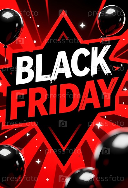Ярко-красная и черная графика создают динамичное ощущение для продажи в пятницу.Жесткий текст привлекает внимание, а чёрные шарики добавляют праздничный оттенок к сцене генеративного ИИ