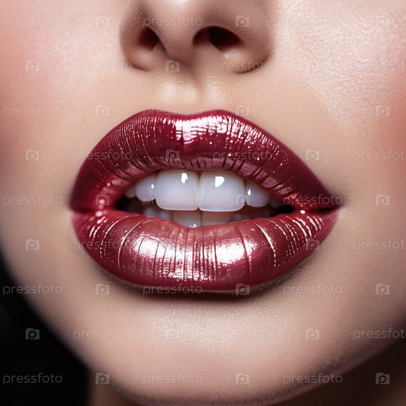 Сустав женских губ с мерцающей жемчужной помадой. Прикосновение искры. Губы слегка расстояны друг от друга, раскрывая блеск белых зубов. Чувственность и сексуальность. Мать жемчужной помады. AI