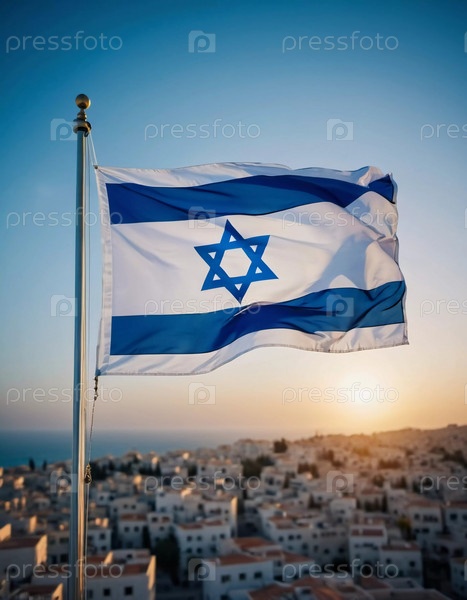 Израильский флаг. просыпается на ветре, с синими и белыми полосами и звездой Давида в центре. ощущение движения и энергии. генерируется ИИ