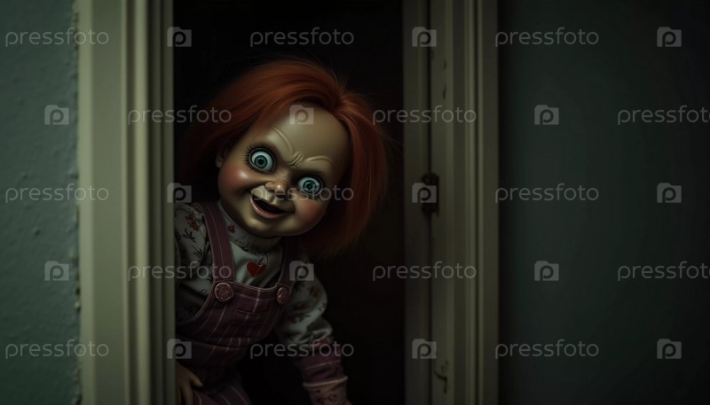 Кукла с пугающими чертами лица заглядывает из шкафа ночью, ее пронзительный взгляд и кривая улыбка создают охлаждающую атмосферу в слабо освещенной комнате