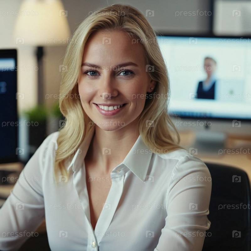 Профессиональная блондинка в белой рубашке сидит за своим столом в современном офисе, излучая уверенность и позитив