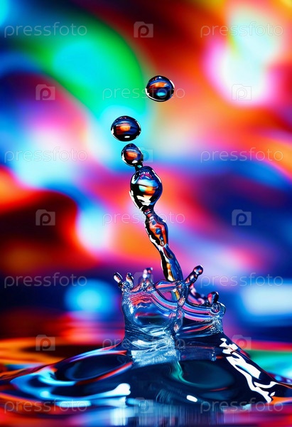 Множество ярких капель вспыхивают в красочный взрыв, создавая потрясающий дисплей ярких оттенков на слегка размытом фоне