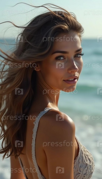 Брюнетка в купальнике оглядывается назад, стоит рядом с береговой линией. Нежные морские волны поднимаются к ее ногам под чистым голубым небом. Длинные волосы, красивое молодое лицо. Путешествия и реклама одежды