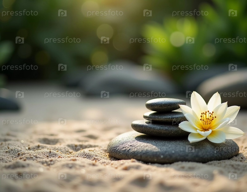 Гладкие камни тщательно складываются рядом с нежной белой лилией в спокойной обстановке сада.Мягкий солнечный свет фильтрует зелень, улучшая мирную атмосферу.Генеративный ИИ