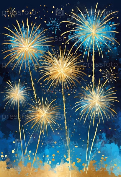 Цветные фейерверки освещают ночное небо, когда люди празднуют Новый год. Вспышки золота и синего вызывают радость и волнение, знаменуя новое начало. Фейерверк взрывается на темном небе. Генеративный ИИ