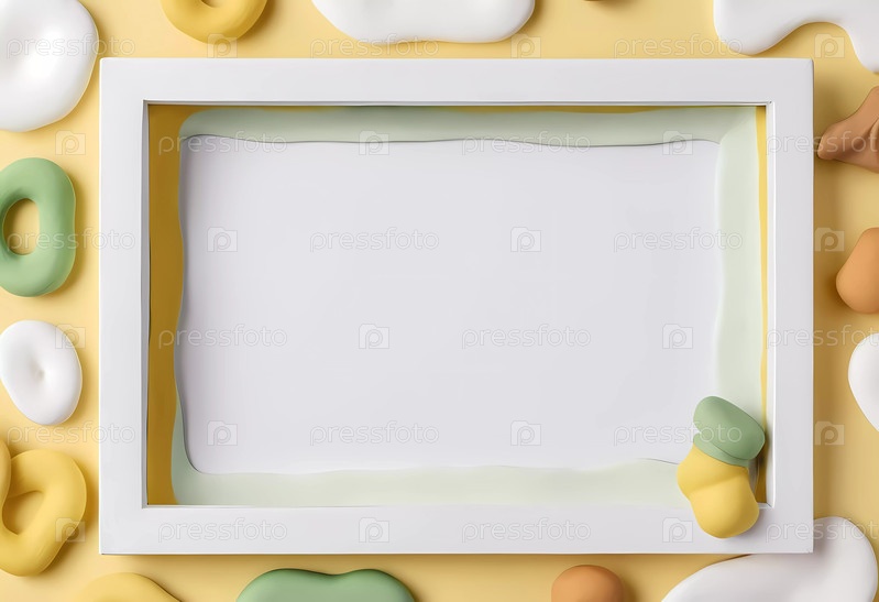 Текстурированный абстрактный фон с белой прямоугольной рамой, граничащей с красочными глиняными формами в зеленом, желтом и коричневом цветах. Идеально подходит для демонстрации творческих проектов. Генерация AI