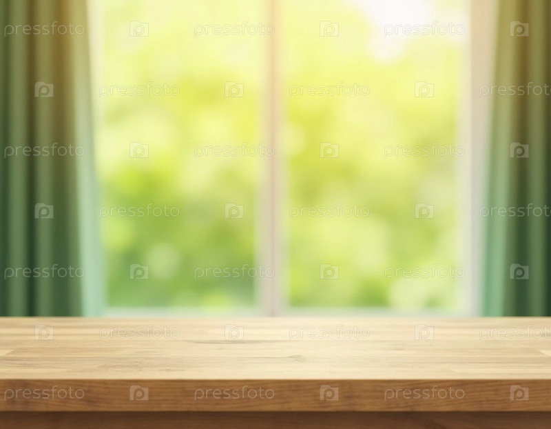 Хорошо освещенный деревянный стол стоит пустым, купаясь в естественном свете из сада снаружи. зелени мягко размываются на заднем плане, создавая мирную атмосферу для выставок или собраний. генерация AI