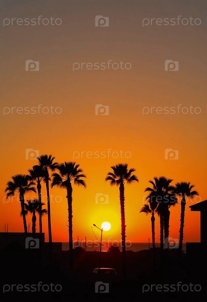 Когда солнце опускается ниже горизонта, пальмы обрамляют горизонт, бросая темные силуэты над зрелищным апельсиновым и желтым небом, вызывая спокойствие и тепло
