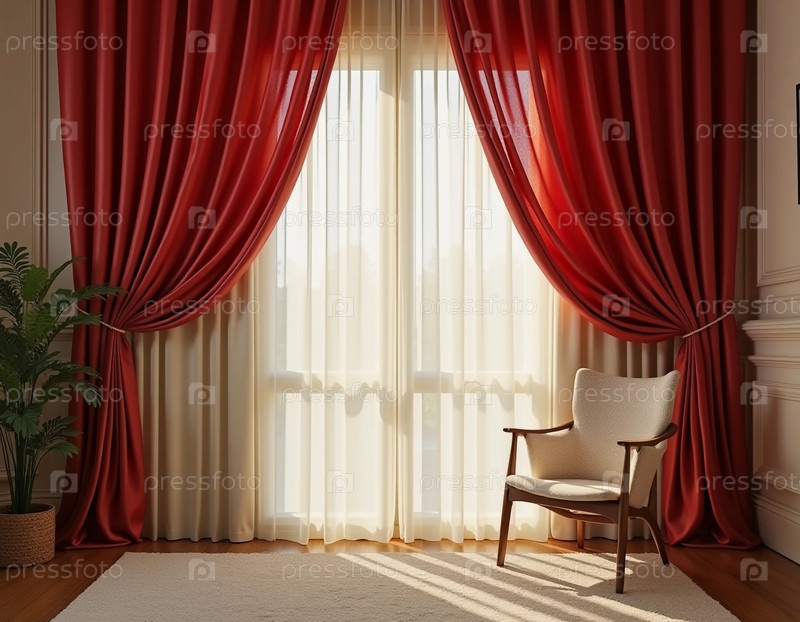 Элегантные шелковые шторы в глубокой малиновой занавеске грациозно окружают простые панели, бросая теплый свет на спокойный интерьер с шикарным стулом и нежным декоративным генеративным AI