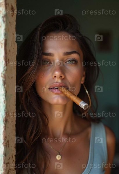Молодая женщина в Гаване наслаждается сигарой, демонстрируя свою естественную красоту и расслабленное поведение.Ее присутствие воплощает дух Кубы в яркий, привлекательный день генеративного ИИ