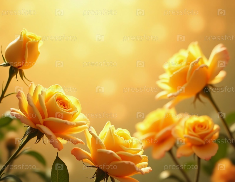 Нежные желтые розы ярко цветут, создавая захватывающее отображение тепла и красоты на фоне блестящего бокеха с мигающими мягкими золотистыми оттенками ощущение магии чистое пространство