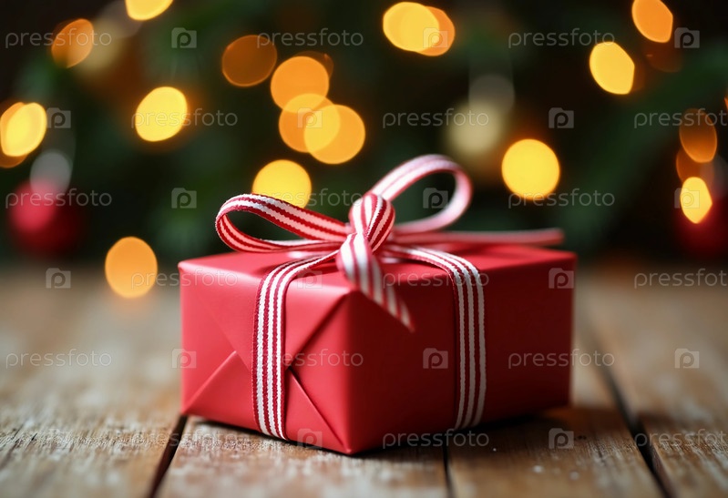 Ярко-красный подарочный ящик, украшенный полосатой ленточкой, опирается на деревянную поверхность