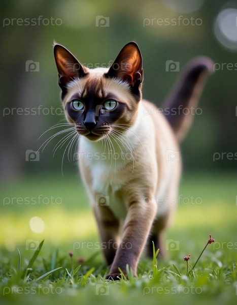 Любопытная сиамская кошка уверенно гуляет по пышной зеленой траве, ее поразительные голубые глаза сияют в нежном солнечном свете тихого сада.Природа окружает эту прекрасную генерирующую AI
