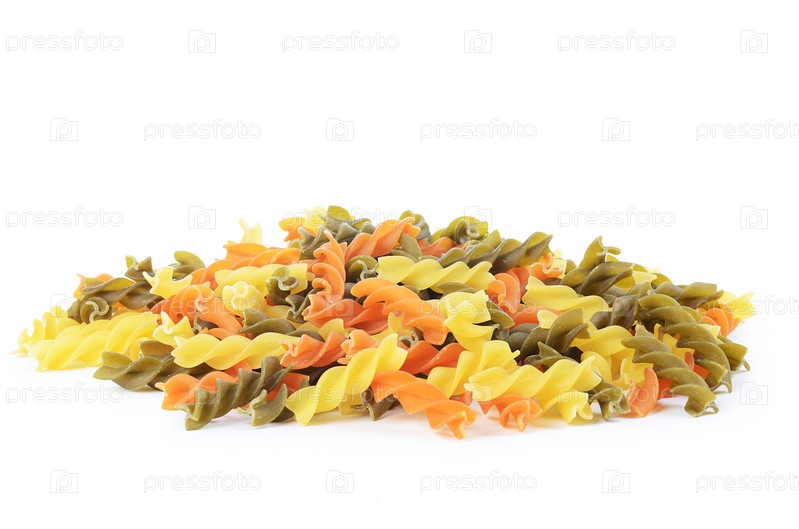 Сфрые разноцветные макароны фузилли, изолированные на белом фоне