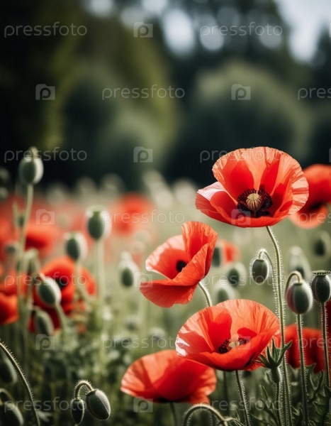 Красный мак с зелеными листьями и стеблями.Маки изображаются на различных стадиях цветения, некоторые полностью открыты, а другие в зародыше.Мягкая спина, создающая деликатное и романтическое ощущение