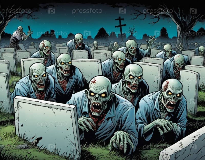 Большая группа зомби, лица которых искажены в выражениях голода и упадка, держащие пустой знак, их бледная, гниющая кожа и пятна крови видны
