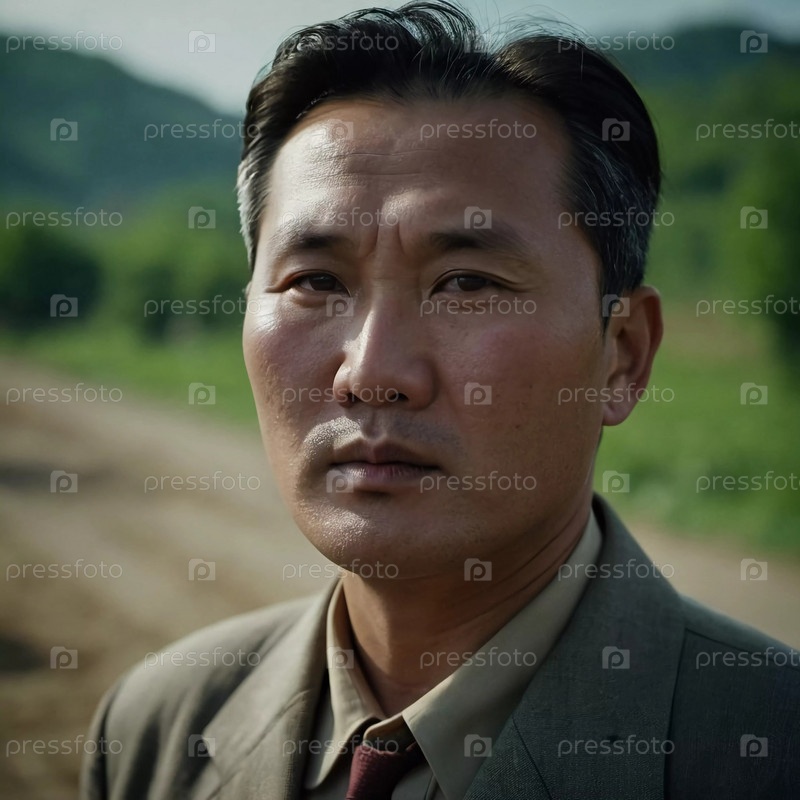 Северокорейский мужчина средних лет изображен с серьезным выражением лица в официальной одежде, внутри внутреннего пространства, которое отражает культуру и окружающую среду региона