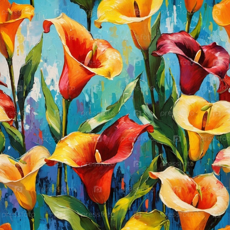 Ярко окрашенные каллы в оттенках красного, желтого, оранжевого и фиолетового цветов заполняют холст среди пышных зеленых листьев на ярко-синем фоне, создавая привлекательный цветный дисплей