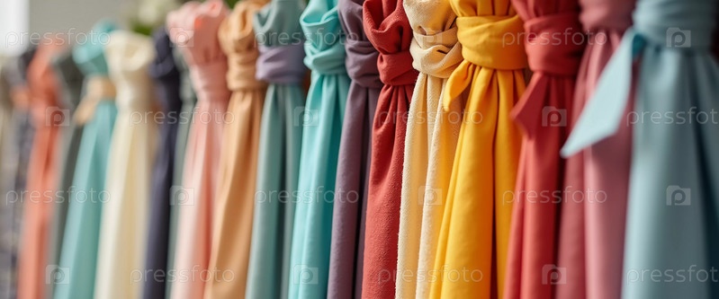 Замысловатые узлы занавесок грациозно висят в текстильном магазине, демонстрируя яркий массив цветов, узоров и текстур при дневном свете