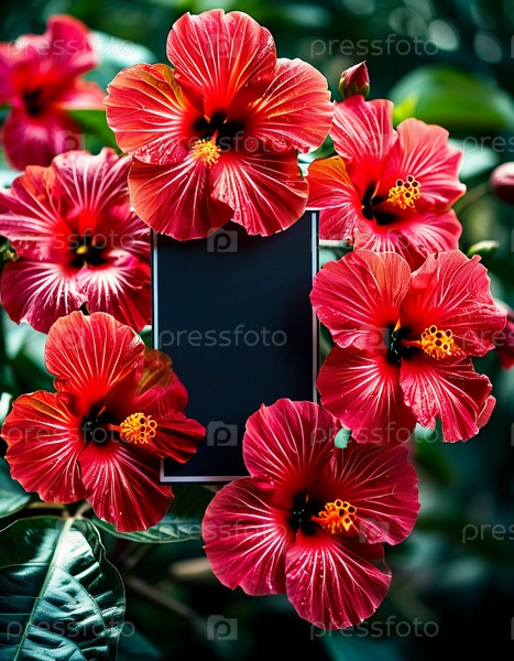 Черное пространство для текста. Красные цветы гибискуса демонстрируют сложные лепестки в саду с цветами. Плодородная зелень создает яркий фон их красоты. Гибиск является родным растением семейства Malvaceae. AI