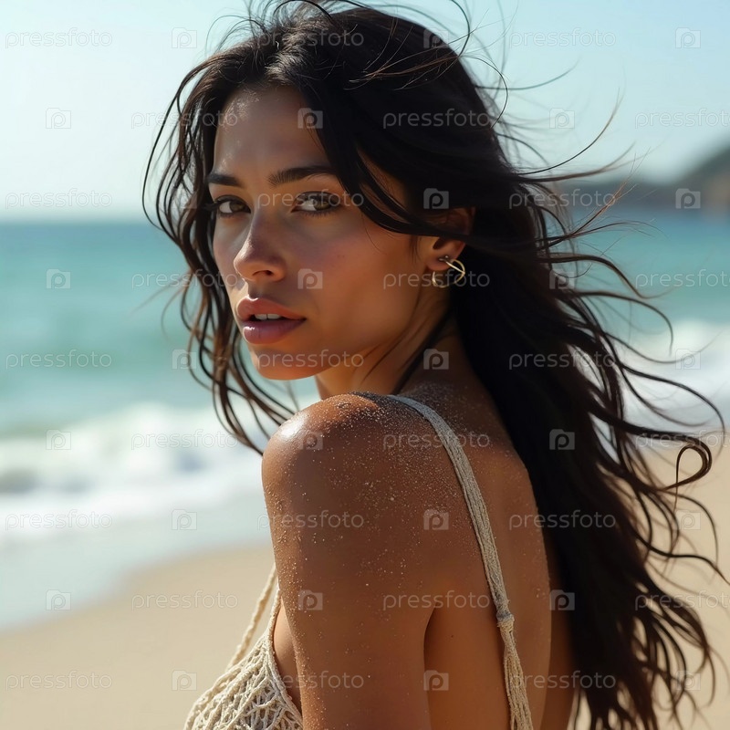 Брюнетка в купальнике оглядывается назад, стоит рядом с береговой линией. Нежные морские волны поднимаются к ее ногам под чистым голубым небом. Длинные волосы, красивое молодое лицо. Путешествия и реклама одежды