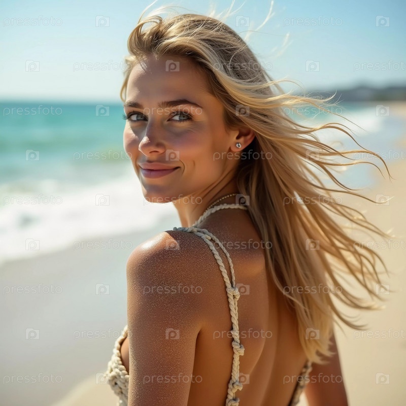 Блондинка в купальнике оглядывается назад, стоит у берега. нежные морские волны поднимаются к ее ногам под чистым голубым небом. длинные волосы, красивое молодое лицо. реклама путешествий и одежды. AI