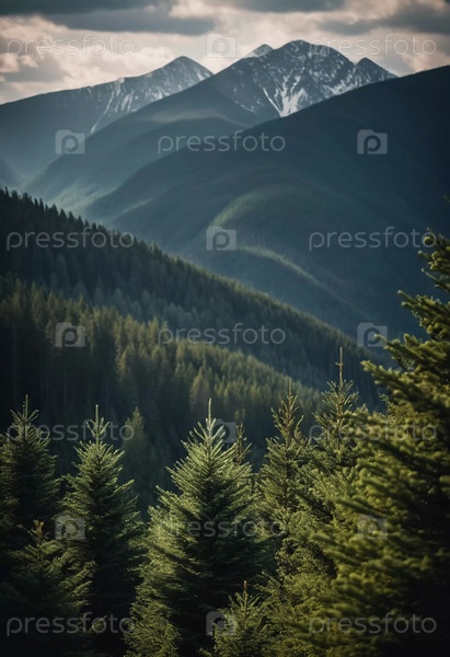 Величественные горы возвышаются над безмятежным пихтовым лесом под драматическим небом, показывая красоту природы на закате. высокие горы с холмами и мрачное небо освещают мирную пустыню