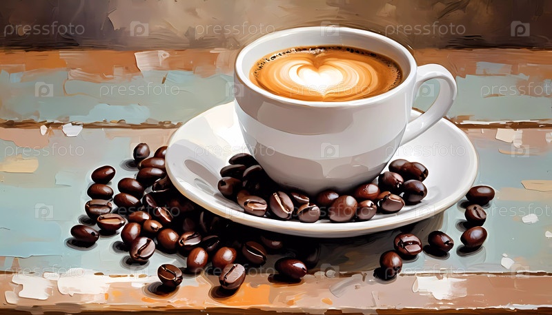 Теплый эспрессо кофе подается в очаровательной белой чашке с дизайном сердца на тарелке кофейных зерен на старинном деревянном столе в уютной атмосфере