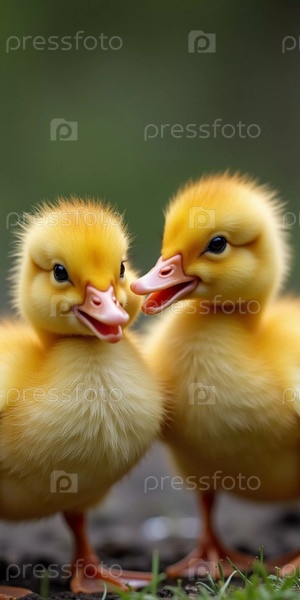 Очаровательные желтые утки стоят вместе, мягкий солнечный свет освещает их пушистые перья