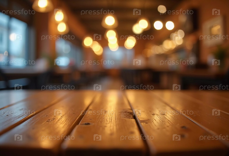 Теплый деревянный стол создает уютную атмосферу в шумном кафе. Мягкие огни освещают фон, где посетители наслаждаются напитками и разговорами