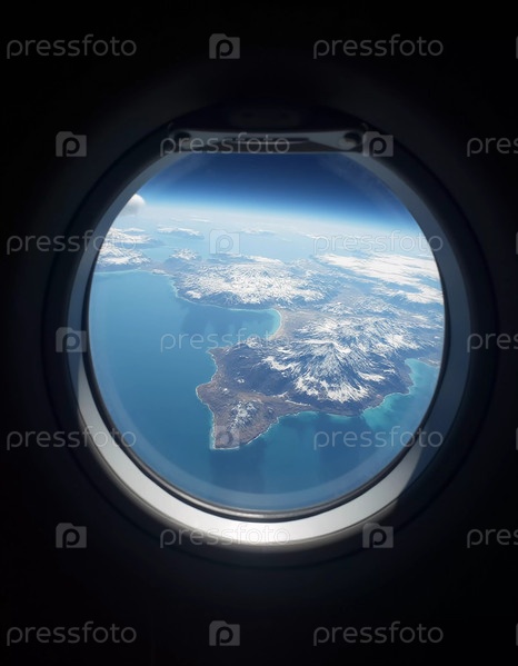 Наблюдение за планетой Земля через окно предлагает захватывающий вид на покрытые снегом горы, безмятежные океаны и рассеянные облака, подчеркивая красоту планеты сверху