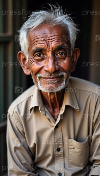 Пожилой мужчина с серебристыми волосами сидит снаружи и предлагает теплую улыбку, которая отражает жизненный опыт