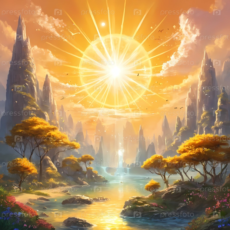 На яркой земле, наполненной высокими горами, восходит сияющее солнце, посылая лучи через искрящуюся воду и золотые деревья, создавая странную атмосферу сказки