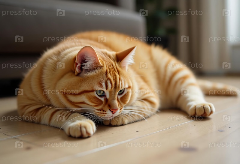 Оранжевый tabby кошка удобно отдыхает на теплом деревянном полу, глаза наполовину закрыты, греется в солнечном свете, стекающем через окно.Игровое очарование окружает этого пушистого спутника