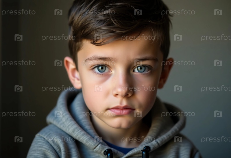 Молодой мальчик из Белоруссии воплощает любопытство и глубину в своем внешнем виде, моделируя неординарный серый пиджак с капюшоном.Мягкий свет освещает его черты лица, создавая спокойную атмосферу Generative AI