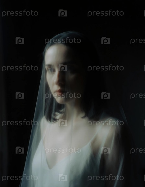 Женщина появляется с полупрозрачной завесой в темной комнате, ее выражение преследует.Мягкий свет бросает вокруг нее жуткое свечение, создавая охлаждающую атмосферу призрачного присутствия генеративного ИИ
