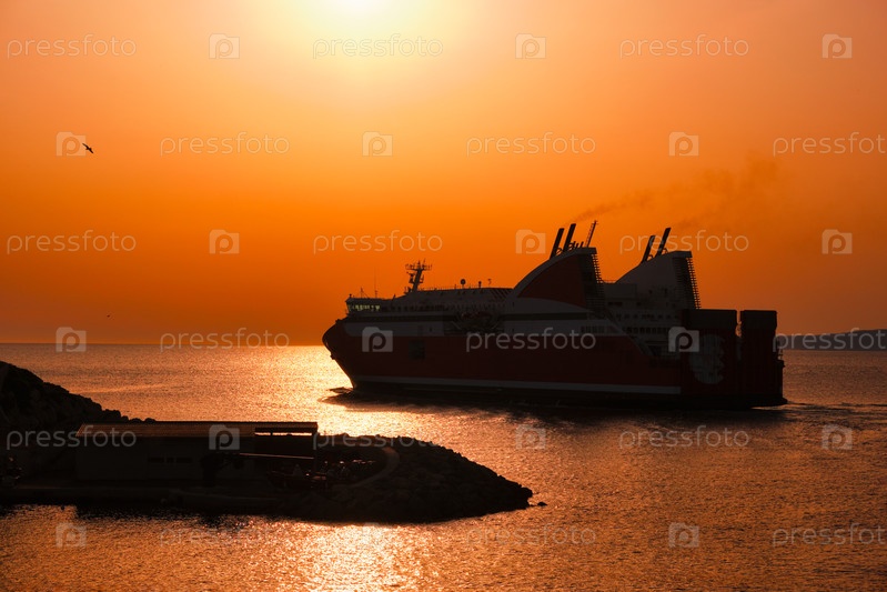 Паромный корабль в морском порту Марселя на Корсику при закате.Марсель, Франция