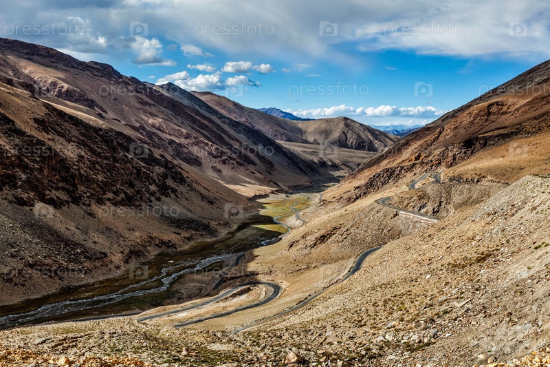 Вид на долину с дорогой возле перевала Танглан-ла - горного прохода в Гималаях вдоль шоссе Ле Манали