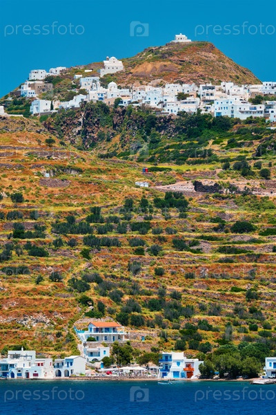 Деревни Клима и Плака с традиционными домами, православная церковь и ветряные мельницы на острове Милос в Греции