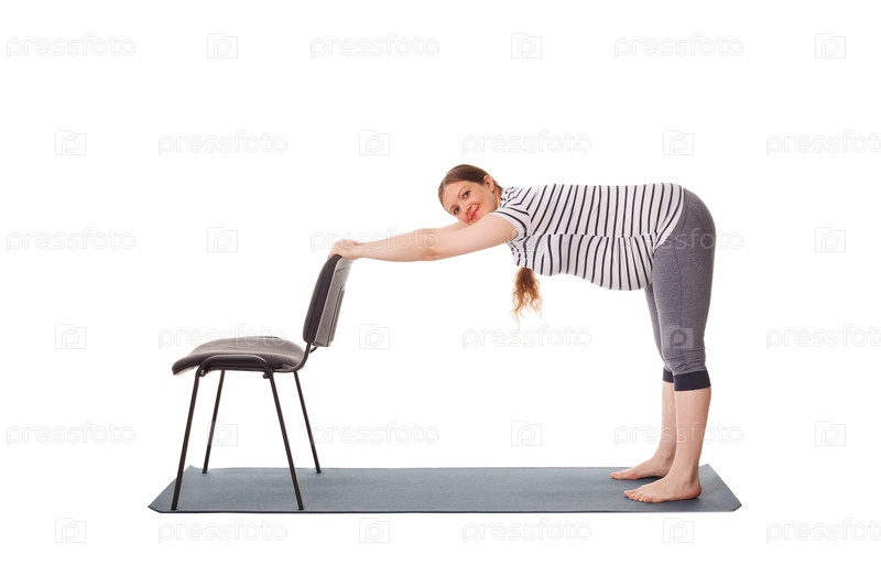 Йога упражнения для беременных женщин - йога асана Uttanasana Стоять вперед складывается Поза с руками на стуле легкой вариации, изолированной на белом фоне
